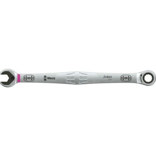 Clé mixte à cliquet Joker 6007 Wera Cliquet réversible : oui Finition : Chromée Longueurs : 205.00 mm Nb de clés : 1 Combinaison unique au monde de mécanisme de cliquet mixte en version longue. Pour les vis à tête hexagonale et écrous hexagonaux. Le levier long permet la transmission de forces élevées. La version longue facilite aussi l'accès aux vissages profondément encastrés. Avec fonction de retenue, grâce à la plaque en métal de la fourche, qui diminue le risque de perdre les vis ou les écrous. La plaque en métal interchangeable de la fourche, munie de dents extradures, sécurise les vis et les écrous et diminue le risque de dérapage. La butée intégrée empêche le dérapage vertical hors de la tête de vis et permet l'application de couples élevés. La forme dodécagonale assure un ajustement parfait avec la vis ou l'écrou, ce qui diminue le risque de dérapage. Un angle de reprise de seulement 30°, côté fourche, évite de perdre du temps à tourner la clé pendant le vissage. Mécanisme de cliquet, côté œil, avec denture exceptionnellement fine de 80 dents pour plus de flexibilité dans les espaces de mon Clé mixte à cliquet Joker 6007, Nb de clés: 1, Cliquet réversible: oui, Longueur: 205.00 mm, Finition: Chromée