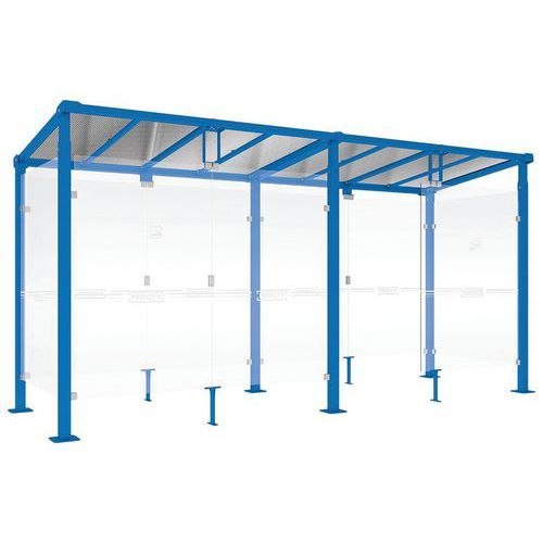 Descriptif du produit :Abri fumeurs Milan bardages fond et latéraux en verre Procity Armature matériau : Acier Coloris : Bleu Finition : Galvanisée Garantie client : 5 ans Longueur hors tout : 5 m Montage : À monter Paroi matériau : Verre Poids du produit : 775 kg Profondeur hors tout : 1.82 m Toiture matériau : Polycarbonate Abri fumeurs Milan avec poteaux carrés en tube acier 80 x 80 mm. Toit ...
