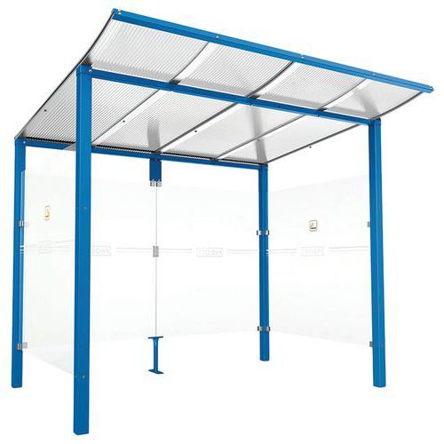 Abri fumeurs Modulo bardages fond et latéraux Procity Armature matériau : Acier Coloris : Bleu Finition : Galvanisée Garantie client : 5 ans Hauteur hors tout : 2.25 m Longueur hors tout : 2.50 m Montage : À monter Paroi matériau : Verre Poids du produit : 280 kg Profondeur hors tout : 2 m Toiture matériau : Polycarbonate Abri fumeurs Modulo avec poteaux carrés tube acier 70 x 70 mm. Toiture : profilés en aluniminum anodisés, traverses en tube acier 40 x 40 mm et panneaux en polycarbonate alvéolaire épaisseur 10 mm traité antiUV. Bardages en verre sécurisé épaisseur 5 mm avec signalétique de sécurité. Finition peint sur galva. Fixation par scellement direct. Abri fumeurs Modulo bardages fond et latéraux, Hauteur hors tout: 2.25 m, Longueur hors tout: 2.50 m, Armature matériau: Acier, Profondeur hors tout: 2 m, Finition: Galvanisée, Coloris: Bleu, Poids: 280 kg, Montage: À monter, Paroi matériau: Verre, Toiture matériau: Polycarbonate