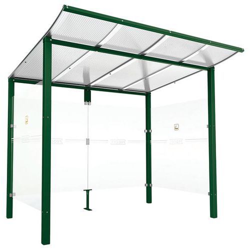 Abri fumeurs Modulo bardages fond et latéraux Procity Armature matériau : Acier Coloris : Vert Finition : Galvanisée Garantie client : 5 ans Hauteur hors tout : 2.25 m Longueur hors tout : 2.50 m Montage : À monter Paroi matériau : Verre Poids du produit : 280 kg Profondeur hors tout : 2 m Toiture matériau : Polycarbonate Abri fumeurs Modulo avec poteaux carrés tube acier 70 x 70 mm. Toiture : profilés en aluniminum anodisés, traverses en tube acier 40 x 40 mm et panneaux en polycarbonate alvéolaire épaisseur 10 mm traité antiUV. Bardages en verre sécurisé épaisseur 5 mm avec signalétique de sécurité. Finition peint sur galva. Fixation par scellement direct. Abri fumeurs Modulo bardages fond et latéraux, Hauteur hors tout: 2.25 m, Longueur hors tout: 2.50 m, Armature matériau: Acier, Profondeur hors tout: 2 m, Finition: Galvanisée, Coloris: Vert, Poids: 280 kg, Montage: À monter, Paroi matériau: Verre, Toiture matériau: Polycarbonate