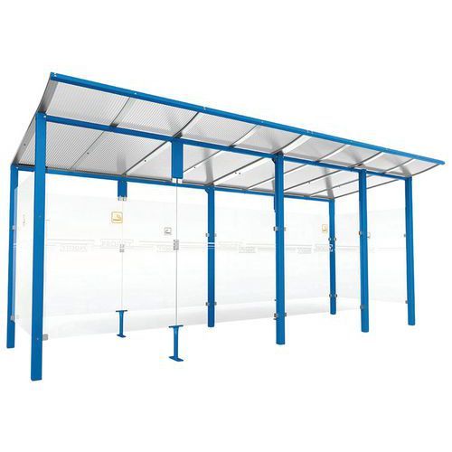 Abri fumeurs Modulo avec bardage retour avant Procity Armature matériau : Acier Coloris : Bleu Finition : Galvanisée Garantie client : 5 ans Hauteur hors tout : 2.25 m Longueur hors tout : 5 m Montage : À monter Paroi matériau : Verre Poids du produit : 520 kg Profondeur hors tout : 2 m Toiture matériau : Polycarbonate Abri fumeurs Modulo avec poteaux carrés tube acier 70 x 70 mm. Toiture : profilés en aluniminum anodisés, traverses en tube acier 40 x 40 mm et panneaux en polycarbonate alvéolaire épaisseur 10 mm traité antiUV. Bardages et retour avant en verre sécurisé épaisseur 5 mm avec signalétique de sécurité. Finition peint sur galva. Fixation par scellement direct. Abri fumeurs Modulo avec bardage retour avant, Hauteur hors tout: 2.25 m, Longueur hors tout: 5 m, Armature matériau: Acier, Profondeur hors tout: 2 m, Finition: Galvanisée, Coloris: Bleu, Poids: 520 kg, Montage: À monter, Paroi matériau: Verre, Toiture matériau: Polycarbonate