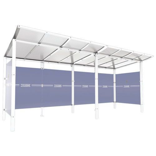 Abri fumeurs Modulo bardages fond et latéraux Procity Armature matériau : Acier Coloris : Blanc Finition : Galvanisée Garantie client : 5 ans Hauteur hors tout : 2.25 m Longueur hors tout : 5 m Montage : À monter Paroi matériau : Verre Poids du produit : 440 kg Profondeur hors tout : 2 m Toiture matériau : Polycarbonate Abri fumeurs Modulo avec poteaux carrés tube acier 70 x 70 mm. Toiture : profilés en aluniminum anodisés, traverses en tube acier 40 x 40 mm et panneaux en polycarbonate alvéolaire épaisseur 10 mm traité antiUV. Bardages en verre sécurisé épaisseur 5 mm avec signalétique de sécurité. Finition peint sur galva. Fixation par scellement direct. Abri fumeurs Modulo bardages fond et latéraux, Hauteur hors tout: 2.25 m, Longueur hors tout: 5 m, Armature matériau: Acier, Profondeur hors tout: 2 m, Finition: Galvanisée, Coloris: Blanc, Poids: 440 kg, Montage: À monter, Paroi matériau: Verre, Toiture matériau: Polycarbonate