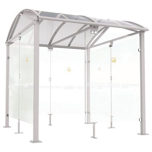 Abri fumeurs Voûte L avec bardages en verre Procity Armature matériau : Acier Coloris : Gris clair Finition : Galvanisée Garantie client : 5 ans Hauteur hors tout : 2.76 m Longueur hors tout : 2.50 m Montage : À monter Paroi matériau : Verre Poids du produit : 520 kg Profondeur hors tout : 2.69 m Toiture matériau : Polycarbonate Abri fumeurs Voûte L avec poteaux carrés tube acier 80 x 80 mm sur platines. Cadre de toiture : traverses en tube acier 40 x 60 mm et gouttières en profilé aluminium, et arceaux en profilés aluminium cintrés. Toiture : voûte en polycarbonate alvéolaire translucide épaisseur 10 mm, traité antiUV. Bardages en verre sécurisé épaisseur 8 mm avec signalétique de sécurité. Finition peint sur galva Abri fumeurs Voûte L avec bardages en verre, Hauteur hors tout: 2.76 m, Longueur hors tout: 2.50 m, Armature matériau: Acier, Profondeur hors tout: 2.69 m, Finition: Galvanisée, Coloris: Gris clair, Poids: 520 kg, Montage: À monter, Paroi matériau: Verre, Toiture matériau: Polycarbonate
