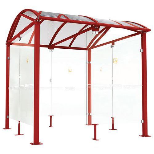 Abri fumeurs Voûte L avec bardages en verre Procity Armature matériau : Acier Coloris : Rouge foncé Finition : Galvanisée Garantie client : 5 ans Hauteur hors tout : 2.76 m Longueur hors tout : 2.50 m Montage : À monter Paroi matériau : Verre Poids du produit : 520 kg Profondeur hors tout : 2.69 m Toiture matériau : Polycarbonate Abri fumeurs Voûte L avec poteaux carrés tube acier 80 x 80 mm sur platines. Cadre de toiture : traverses en tube acier 40 x 60 mm et gouttières en profilé aluminium, et arceaux en profilés aluminium cintrés. Toiture : voûte en polycarbonate alvéolaire translucide épaisseur 10 mm, traité antiUV. Bardages en verre sécurisé épaisseur 8 mm avec signalétique de sécurité. Finition peint sur galva Abri fumeurs Voûte L avec bardages en verre, Hauteur hors tout: 2.76 m, Longueur hors tout: 2.50 m, Armature matériau: Acier, Profondeur hors tout: 2.69 m, Finition: Galvanisée, Coloris: Rouge foncé, Poids: 520 kg, Montage: À monter, Paroi matériau: Verre, Toiture matériau: Polycarbonate