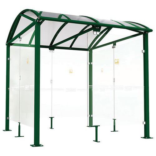 Abri fumeurs Voûte L avec bardages en verre Procity Armature matériau : Acier Coloris : Vert Finition : Galvanisée Garantie client : 5 ans Hauteur hors tout : 2.76 m Longueur hors tout : 2.50 m Montage : À monter Paroi matériau : Verre Poids du produit : 520 kg Profondeur hors tout : 2.69 m Toiture matériau : Polycarbonate Abri fumeurs Voûte L avec poteaux carrés tube acier 80 x 80 mm sur platines. Cadre de toiture : traverses en tube acier 40 x 60 mm et gouttières en profilé aluminium, et arceaux en profilés aluminium cintrés. Toiture : voûte en polycarbonate alvéolaire translucide épaisseur 10 mm, traité antiUV. Bardages en verre sécurisé épaisseur 8 mm avec signalétique de sécurité. Finition peint sur galva Abri fumeurs Voûte L avec bardages en verre, Hauteur hors tout: 2.76 m, Longueur hors tout: 2.50 m, Armature matériau: Acier, Profondeur hors tout: 2.69 m, Finition: Galvanisée, Coloris: Vert, Poids: 520 kg, Montage: À monter, Paroi matériau: Verre, Toiture matériau: Polycarbonate