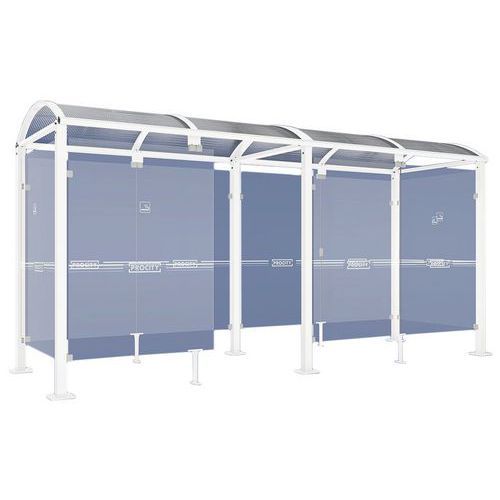 Abri fumeurs Voûte M bardages fond et latéraux Procity Armature matériau : Acier Coloris : Blanc Finition : Galvanisée Garantie client : 5 ans Hauteur hors tout : 2.54 m Longueur hors tout : 5 m Montage : À monter Paroi matériau : Verre Poids du produit : 635 kg Profondeur hors tout : 1.66 m Toiture matériau : Polycarbonate Abri fumeurs Voûte M avec poteaux en acier 80 x 80 mm sur platines. Toiture de l'abri : cadre composé de deux traverses en tube aluminium 40 x 60 mm et de deux gouttières en profié aluminium. Arceaux en profilés aluminium cintrés. Voûte en polycarbonate alvéolaire translucide épaisseur 6 mm antiuv, bardages en verre sécurisé de 8 mm. Peint sur galva Abri fumeurs Voûte M bardages fond et latéraux, Hauteur hors tout: 2.54 m, Longueur hors tout: 5 m, Armature matériau: Acier, Profondeur hors tout: 1.66 m, Finition: Galvanisée, Coloris: Blanc, Poids: 635 kg, Montage: À monter, Paroi matériau: Verre, Toiture matériau: Polycarbonate