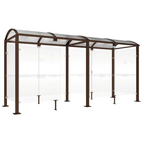 Abri fumeurs Voûte M bardages fond et latéraux Procity Armature matériau : Acier Coloris : Marron foncé Finition : Galvanisée Garantie client : 5 ans Hauteur hors tout : 2.54 m Longueur hors tout : 5 m Montage : À monter Paroi matériau : Verre Poids du produit : 635 kg Profondeur hors tout : 1.66 m Toiture matériau : Polycarbonate Abri fumeurs Voûte M avec poteaux en acier 80 x 80 mm sur platines. Toiture de l'abri : cadre composé de deux traverses en tube aluminium 40 x 60 mm et de deux gouttières en profié aluminium. Arceaux en profilés aluminium cintrés. Voûte en polycarbonate alvéolaire translucide épaisseur 6 mm antiuv, bardages en verre sécurisé de 8 mm. Peint sur galva Abri fumeurs Voûte M bardages fond et latéraux, Hauteur hors tout: 2.54 m, Longueur hors tout: 5 m, Armature matériau: Acier, Profondeur hors tout: 1.66 m, Finition: Galvanisée, Coloris: Marron foncé, Poids: 635 kg, Montage: À monter, Paroi matériau: Verre, Toiture matériau: Polycarbonate