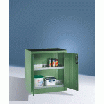 Descriptif du produit :Non soudée sur 2 piétements laissant passer sous l\'armoire.Peinture époxy blanc RAL 9010.2 portes battantes avec pictogramme normalisé pharmacie, fermeture à clef.Equipement intérieur : 3 étagères réglables en hauteur sur crémaillère dont une avec gradin.1 coffre à toxiques H/l/P 330 x 530 x 465 mm, faisant étagère avec gradin, avec serrure de sûreté et 2 clés avec pictogramme no ...