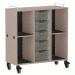 Armoire basse corps en LIGNOpal, panneau de particules fines mélaminé avec chants collés en matière synthétique (MS).Avec parois intermédiaires collées.Colonne perforée (25 mm) avec tablettes et panneau arrière en tôle d\'acier perforée.2 colonnes avec 5 bacs en plastique, hauteur 15 cm, sur rail de guidage.1 colonne avec 1 porte à battant, poignée étrier, tablettes amovibles.Système de verrouillage avec serrure à barillet.Aimants fixés sur les parois latérales pour la liaison avec d\'autres éléments.2 barres de préhension métalliques fixées sur l\'armoire.Livré monté.