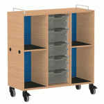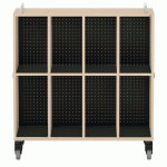 Armoire basse corps en LIGNOpal, panneau de particules fines mélaminé avec chants collés en matière synthétique (MS).Avec parois intermédiaires collées.Colonne perforée (25 mm) avec tablettes et panneau arrière en tôle d\'acier perforée.2 colonnes avec 5 bacs en plastique, hauteur 15 cm, sur rail de guidage.1 colonne avec 1 porte à battant, poignée étrier, tablettes amovibles.Système de verrouillage avec serrure à barillet.Aimants fixés sur les parois latérales pour la liaison avec d\'autres éléments.2 barres de préhension métalliques fixées sur l\'armoire.Livré monté.
