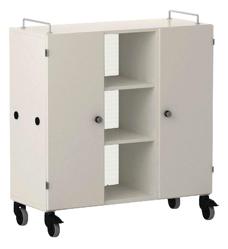 Armoire basse corps en LIGNOpal, panneau de particules fines mélaminé avec chants collés en matière synthétique (MS).Avec parois intermédiaires collées.Colonne perforée (25 mm) avec tablettes et panneau arrière en tôle d\'acier perforée.2 colonnes avec 5 bacs en plastique, hauteur 15 cm, sur rail de guidage, 2 portes à battant, poignée étrier.Système de verrouillage avec serrure à barillet.Aimants fixés sur les parois latérales pour la liaison avec d\'autres éléments.2 barres de préhension métalliques fixées sur l\'armoire.Livré monté.