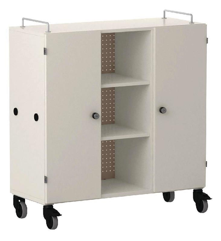 Armoire basse corps en LIGNOpal, panneau de particules fines mélaminé avec chants collés en matière synthétique (MS).Avec parois intermédiaires collées.Colonne perforée (25 mm) avec tablettes et panneau arrière en tôle d\'acier perforée.2 colonnes avec 5 bacs en plastique, hauteur 15 cm, sur rail de guidage, 2 portes à battant, poignée étrier.Système de verrouillage avec serrure à barillet.Aimants fixés sur les parois latérales pour la liaison avec d\'autres éléments.2 barres de préhension métalliques fixées sur l\'armoire.Livré monté.