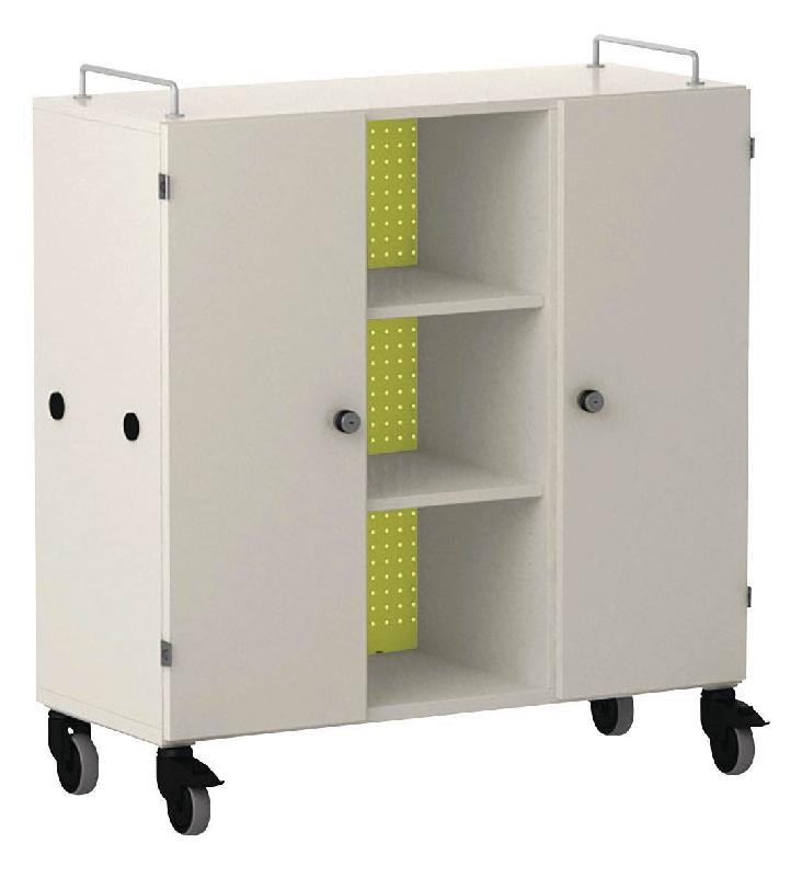 Armoire basse corps en LIGNOpal, panneau de particules fines mélaminé avec chants collés en matière synthétique (MS).Avec parois intermédiaires collées.Colonne perforée (25 mm) avec tablettes et panneau arrière en tôle d\'acier perforée.2 colonnes avec 5 bacs en plastique, hauteur 15 cm, sur rail de guidage, 2 portes à battant, poignée étrier.Système de verrouillage avec serrure à barillet.Aimants fixés sur les parois latérales pour la liaison avec d\'autres éléments.2 barres de préhension métalliques fixées sur l\'armoire.Livré monté.