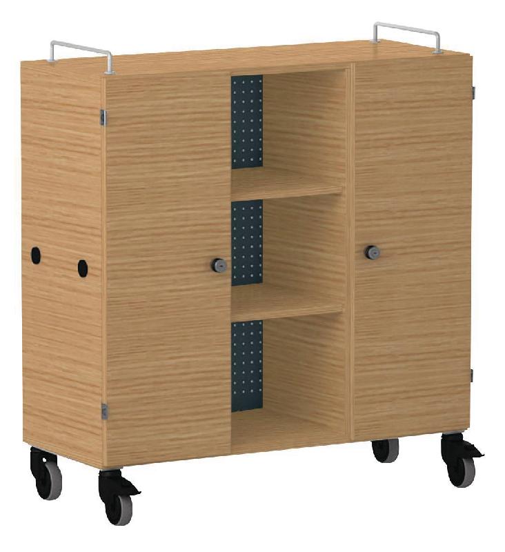 Armoire basse corps en LIGNOpal, panneau de particules fines mélaminé avec chants collés en matière synthétique (MS).Avec parois intermédiaires collées.Colonne perforée (25 mm) avec tablettes et panneau arrière en tôle d\'acier perforée.2 colonnes avec 5 bacs en plastique, hauteur 15 cm, sur rail de guidage, 2 portes à battant, poignée étrier.Système de verrouillage avec serrure à barillet.Aimants fixés sur les parois latérales pour la liaison avec d\'autres éléments.2 barres de préhension métalliques fixées sur l\'armoire.Livré monté.