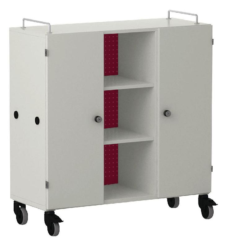 Armoire basse corps en LIGNOpal, panneau de particules fines mélaminé avec chants collés en matière synthétique (MS).Avec parois intermédiaires collées.Colonne perforée (25 mm) avec tablettes et panneau arrière en tôle d\'acier perforée.2 colonnes avec 5 bacs en plastique, hauteur 15 cm, sur rail de guidage, 2 portes à battant, poignée étrier.Système de verrouillage avec serrure à barillet.Aimants fixés sur les parois latérales pour la liaison avec d\'autres éléments.2 barres de préhension métalliques fixées sur l\'armoire.Livré monté.