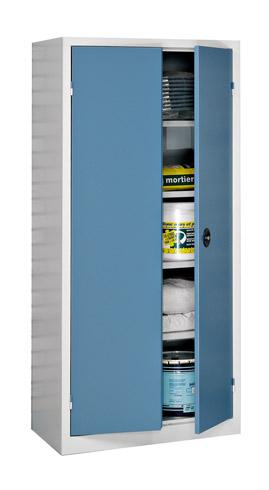 - Structure tôle d'acier 10/10e, assemblage soudé. Corps gris clair RAL 7035. Portes battantes bleues ou grises avec renfort central sur chaque porte, pour une rigidité et une sécurité maximum. Fermeture 2 points par crémone. Serrure ergonomique. 4 tablettes en aluminium zingué, réglables en hauteur tous les 5 cm. Charge utile par tablette : 100 Kg. Largeur : 100 cm (utiles 99 cm) ou 120 c ...