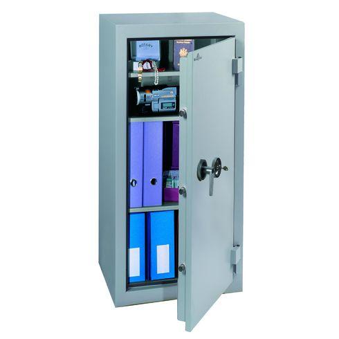 - Protégez vos documents importants et objets de valeur du vol ou de l’incendie dans l’armoire forte anti feu double paroi Hartmann. Avec un corps indéformable et monobloc d’épaisseur 30 mm, un matériau réfractaire bloquant la montée en température, elle garantit la protection optimale de son contenu. Cette armoire dispose de plaques d’acier au manganèse anti-perçage pour renforcer les organes de condamnation. Très sécurisée, sa porte épaisse de 70 mm est condamnée par pênes actifs/passifs, tournants et anti-sciage, de 25 mm de diamètre. Dotée de tablettes métal réglables en hauteur tous les 40 mm, ce mobilier assure un classement ordonné des articles à l’intérieur. Sa résistance pour 80 kg de charge avec rail pour dossiers suspendus permet de contenir un grand volume. Avec une facilité d’ouverture, ses portes pivotent à 200°. Équipée de 2 trous de scellement de 14 mm de diamètre à la base (visserie non fournie). Serrure WITTKOPP testée A2P niveau A. Finition peinture époxy couleur gris RAL 9006.Existe 4 capacités : 190, 370, 400 et 680 litres.Certifiée anti-feu avec une résistance de 30 min. Norme DIN 4102.Livraison gratuite en rez-de-chaussée (moins de 3 marches) et en étage si monte-charge accessible avec moins de 20 mètres de roulage. Tarif de livraison sur devis dans les autres cas.