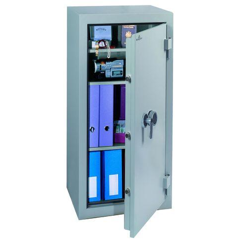 - Pour classer vos documents importants en toute sécurité, choisissez l’armoire forte anti feu double paroi serrure électronique Hartmann. Pour vous fournir un rangement optimal, ce mobilier dispose de tablettes métal, réglables en hauteur tous les 4 cm. Pratiques et résistantes, les tablettes sont munies d’un rail pour dossiers suspendus et peuvent supporter une charge maximum de 80 kg. Le meuble est équipé de 2 trous de scellement à la base, de 14 mm de diamètre (visserie non fournie) afin d’assurer sa stabilité. Cette armoire résiste au feu et protège vos documents en cas d’incendie. Son corps indéformable et monobloc, d’une épaisseur de 3 cm, bloque la montée en température grâce à son matériau réfractaire. En cas de vol, l’armoire possède une structure anti-perçage, car elle est munie de renfort de condamnation par plaques d’acier au manganèse. Pour vous offrir une sécurité optimale, l’armoire est dotée d’une porte de 7 cm d’épaisseur (finition peinture époxy gris RAL 9006) avec serrure de coffre fort classe 2 BDS (1 000 000 de combinaisons alphanumériques, intatâble, temporisation après la 3e erreur). Elle est également équipée d’une condamnation de la porte par pênes actifs/passifs de 25 mm de diamètre. L’ouverture des portes est à 200°, ce qui permet une vue d’ensemble du contenu. Une sécurité supplémentaire que vous apprécierez : ce modèle bénéficie également d'un verrouillage actif par pênes de condamnation tournants anti-sciage de 25 mm de diamètre, une alimentation par pile avec système extérieur de secours avec 1 code maître et 1 code utilisateur programmables. Ce meuble certifié DIN 4102 est disponible en 4 modèles. Dimensions : H 100 x L 60 x P 48 cm. Dimensions utiles : H 94 x L 54 x P 37,5 cm.