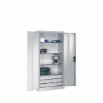 Descriptif du produit :Construction robuste en tôle d\'acier (armoires soudées)Verrouillage 3 points.Angle d\'ouverture des portes : 110°. Serrure à cylindre. 6 tablettes galvanisées réglables en hauteur au pas de 15 mm.Charge maxi par tablette : 70 kg.4 tiroirs coulissants sur glissières à 80% de leur profondeur avec butée. Charge maxi par tiroir : 30 kg. Hauteur réglable au pas de 88 mm.Hauteur armoire : 195 ...
