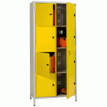 Structure tôle électrozinguée ép. 10/10 ème.Portes tôle électrozinguée ép. 10/10 ème, indégondables en position ouverte ou fermée avec oméga de renfort soudé sur chaque porte (rigidité accrue). Tablette intérieure galvanisée évitant les rayures.Fermeture 3 points par serrure unique (accès sécurisé), fermeture de chaque casier par moraillon porte-cadenas 3 points dans boîtier ...