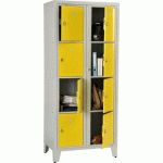 Structure tôle électrozinguée ép. 10/10 ème.Portes tôle électrozinguée ép. 10/10 ème, indégondables en position ouverte ou fermée avec oméga de renfort soudé sur chaque porte (rigidité accrue). Tablette intérieure galvanisée évitant les rayures.Fermeture 3 points par serrure unique (accès sécurisé), fermeture de chaque casier par moraillon porte-cadenas 3 points dans boîtier encastré. Cadenas non fourni (Ø 6 à 8 mm).86 kg.