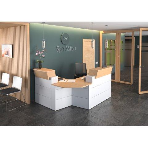 - Voici un modèle fonctionnel qui répond à vos exigences ergonomiques : la banque d’accueil d’angle compacte L 203 x P 163 cm Quadri. Vous ne serez pas déçus en la choisissant, surtout en matière de qualité.Ce pack est composé de différents éléments :1 Banque d'accueil haute Quadri L80 cm. Dimensions : H 110 x L80 x P 83 cm.1 Banque d'accueil haute Quadri L120 cm. Dimensions : H 110 x L120 x P 83 cm.1 Banque d'angle Quadri pour personnes à mobilité réduite L83 cm. Dimensions : H 74 x L 83 x P 83 cm, positionnable à droite ou à gauche.En ce qui concerne les 2 banques d’accueil hautes :Leur plan de travail sous le comptoir permet une certaine discrétion pour la personne à l’accueil. Le client peut également utiliser aisément la partie haute. Elles sont entièrement réalisées en panneaux de particules mélaminées de 25 mm d’épaisseur avec des chants en ABS de 2 mm d’épaisseur, gages de leur robustesse. Les 2 liserés en aluminium et la couleur chêne rendent ces modèles accueillants et esthétiques.Grâce à la tablette amovible avec passe-câbles, vous pouvez créer une niche réglable en 3 positions (hauteur 42, 45 ou 48 cm) pour s'adapter au format de votre ordinateur (compatible avec écran jusqu'à 19 pouces).En ce qui concerne la banque d’angle :Vous pouvez optimiser votre plan de travail avec la banque d’angle pour personnes à mobilité réduite. Résistant, ce mobilier est conçu dans des panneaux de particules mélaminées de 25 mm d’épaisseur avec chants ABS de 2 mm. Ce mobilier d’accueil alliant praticité et design est équipé d’un angle à 90°, d’un plateau décor chêne et d’un corps décor blanc avec 2 liserés aluminium.À fixer entre les 2 banques d’accueil (à droite ou à gauche).Pour plus de confort, vous pouvez remplacer les pieds panneaux par un pied de renfort afin de permettre un meilleur dégagement au niveau des jambes.Ce produit est écoresponsable car sa certification NF Environnement implique un mode de production écologique (limitation des impacts sur l’environnement de la fabrication jusqu’à l’élimination du produit) en plus d’une qualité conforme à des normes.Il a été fabriqué à base de 50 % minimum de matériau recyclé.Montage en option