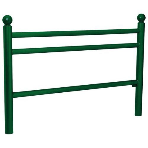 Descriptif du produit :Barrière Trio 1.57 m pommeau Boule zinc Procity Coloris : Vert Finition : Époxy Garantie client : 5 ans Hauteur hors tout : 110.2 cm Largeur hors tout : 7.6 cm Longueur hors tout : 157 cm Matériaux : Acier Poids du produit : 25 kg Barrière Trio avec poteaux en tubes acier Ø 76 mm, épaisseur 3 mm. Lisses horizontales Ø 50 mm, épaisseur 2 mm. Pommeau Boule. Peint sur zinc. Fix ...