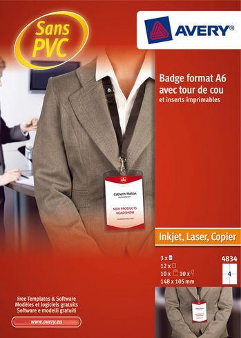 - Identifiez facilement votre personnel et vos visiteurs, en adoptant ce badge géant Avery. Vous pouvez y afficher de nombreuses informations telles que le plan, le planning d’évènement ou un code-barre d’identification. De quoi aussi orienter au mieux les personnes pendant les salons, les formations et les conférences !Cet article est proposé en kit comprenant 10 pochettes pour badge de 148 x 105 mm. Réalisées en polypropylène transparent, leur résistance n’est plus à prouver. Elles protégeront efficacement les inserts. Vous disposez également de 12 inserts pratiques, facilement imprimables au recto/verso. Ils sont proposés sur 3 feuillets A4 (4 inserts par feuille) en papier blanc 190 g/m². Pour les personnaliser, vous pouvez utiliser une imprimante jet d’encre ou laser. Pour une impression réussite, pensez à vous procurer le logiciel gratuit et les modèles sur [...] code logiciel à utiliser est le : 4834. pour faciliter la manipulation et le port, 10 lacets noirs accompagnent le lotformat L 105 x H 148 mm
