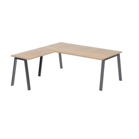 - Adoptez ce bureau d’angle Ecla au design d'inspiration scandinave dans sa version piètement métal. Ce bureau d’angle offre une grande surface de travail grâce à son retour.Composition : Plateaux robustes en panneaux de particules d’épaisseur 25 mm, avec revêtement mélaminé et traité anti-reflets.Plateau principal de bureau pré-débouché : vous pourrez opter pour ajouter un top access central et 2 obturateurs (80 mm) ronds ou carrés (en option).Chants en ABS de 2 mm d’épaisseur assortis au décor.Retour simple à fixer en bout de plateau pour composer un angle. Positionnable à droite ou à gauche du bureau lors du montage.Piètement métallique type arche inclinée.Poutre de renfort sur toute la longueur du plateau.Vérins de mise à niveau pour ajustement face aux irrégularités du sol.Dimensions : Dimensions totales : L 200 x H 75 cm x P 200 cm.Dimensions du plateau principal : L 200 x P 100 cm.Dimensions du retour : L 100 x P 60 cm.Accessoires en option :Différents types d'accessoires compatibles pour les emplacements pré débouchés 80 mm : passe-câbles simple, chargeur induction sans fil, multiprise encastrable...Passe-câbles diamètre 80 mm - lot de 2 (Référence : 708345).Top access central (Référence : 706474).Goulotte passe-câbles horizontales Ecla à fixer sur poutre (Référence : 710364).Goulotte verticale pour le passage de câble dans les pieds Chargeur induction sans fil - technologie QI (Référence : 711384).Voile de fond métal pour bureau Ecla (Référence : 715638).Montage :Meuble livré démonté. Montage en option.Normes et environnement :Ce produit est écoresponsable car il est certifié PEFC. Label international, PEFC assure une gestion durable des forêts et garantit l’origine et la traçabilité du bois utilisé dans la fabrication des produits.Fabrication française.