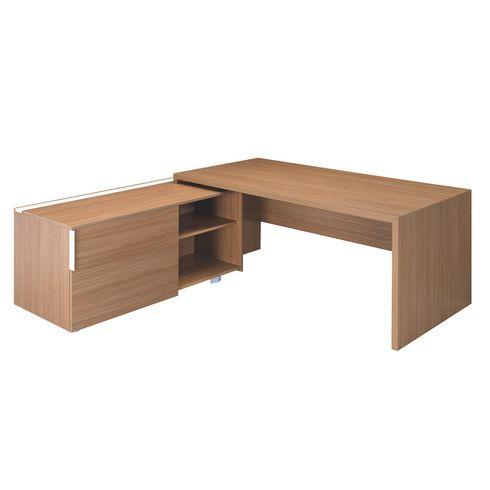 - Optimisez votre espace de travail et votre rangement avec le bureau Essenzza avec retour sur desserte. Ce bureau d'angle solide se compose d’une table de bureau et d’un retour avec desserte à portes coulissantes placé à gauche ou à droite. Le retour vous offre une grande surface de travail et de classement en plus.Composition: Plateau en panneau de particules mélaminé d’épaisseur 38 ...