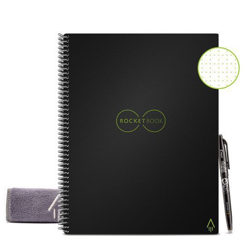 Cahier Rocketbook Core Letter Infinity noir BIC Coloris : Noir Ergonomique : non Grammage : 135 g/m² Nb de pages : 42 Réglure : Aucune Sélection télétravail : oui Type de reliure : À spirale Avec le carnet connecté Rocketbook Core, passez facilement du papier au digital : scannez vos notes et sauvegardezles où vous voulez. Misez sur une alternative écologique : effaçable à l’eau, chaque page de ce cahier digital est réutilisable. À l’école ou au travail, ses 32 pages à points se plient à vos envies : dessins, croquis, schémas, prise de notes, tout est permis. Indéchirable, le papier du Rocketbook Core est fabriqué à partir de minéraux pour une résistance et une douceur incomparables. Léger et pratique avec son format A4, ce cahier réutilisable se glisse dans votre sac à dos ou votre sacoche pour vous suivre partout. Cahier Rocketbook Core Letter Infinity noir, Grammage: 135 g/m², Réglure: Aucune, Nb de pages: 42, Type de reliure: À spirale, Coloris: Noir, Sélection télétravail: oui