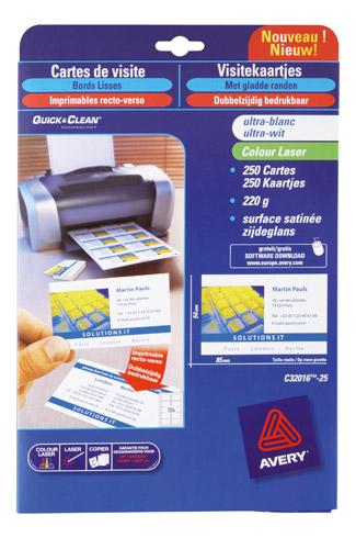 - Créez de jolies cartes de visite à l’image de votre entreprise avec la Carte de visite laser Avery Quick and Clean. Conditionnée en planche de format A4, conçue pour 10 cartes, elle est personnalisable avec une imprimante laser couleur et monochrome. Pour ce faire, vous n’aurez qu’à utiliser le logiciel ''Avery Design & Print Online '' téléchargeable gratuitement sur [...] code C32016 vous donnera accès à ce logiciel. Avec ce type de carte, vous pourrez aisément faire une impression en recto-verso. Grâce à la technologie Quick & Clean, la séparation se fait facilement et le séchage est instantané. Après impression, il vous suffit de la plier et la carte se détache de son support. fabriquée dans un grammage élevé à 220 g, cette carte de visite profite d’une qualité professionnelle. Sur Bruneau, cet article est conditionné en lot de 25 planches de 10 cartes, soit 250 cartes au total. Et n’oubliez pas une chose : c’est un produit recyclable pour le bien-être de l’environnement ! Format 85 x 54 mm.