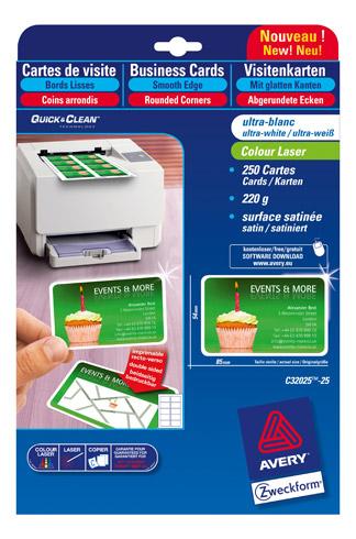 Descriptif du produit :- Bords lisses grâce à la technologie Quick&Clean, les cartes se détachent facilement par simple pliage. Impression possible recto-verso. Compatible laser couleur et monochrome. Séchage instantané. Grammage élevé 220 grammes, qualité professionnelle, couleur blanche finition mate. Coins arrondis . Facile à personnaliser et à imprimer grâce au logiciel ''Avery Design & Print Online '' tà ...