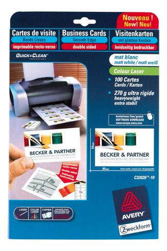- Impressionnez vos collaborateurs avec la carte de visite signée Avery Quick and Clean. Personnalisable, ce produit est l’outil qu’il vous faut pour se démarquer du lot. Elle vous séduira par sa finition aux bords lisses et ses coins droits. Ce modèle réalisé à partir de papier 270 g d'une très bonne tenue, recyclable et en finition mate, elle vous offrira une qualité professionnelle pour valoriser votre activité. En planche A4, les 2 côtés de la carte sont imprimables sur une imprimante laser couleur et monochrome. Pensez tout de même à vous procurer le logiciel « Avery Design & Print Online » téléchargeable gratuitement sur [...] et utilisez le code logiciel C32026 pour faciliter la personnalisation. Une fois l’impression terminée, les cartes se détachent facilement par simple pliage grâce à aux bords lisses et la technologie Quick & Clean. Chez Bruneau, ce produit vous est proposé dans une pochette de 100 cartes (10 planches A4 de 10 cartes 85 x 54 mm)