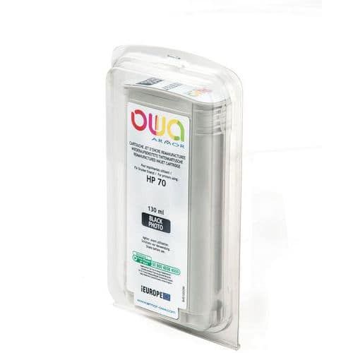 Cartouche d'encre traceur remanufacturée HP 70 Owa Approche écoresponsable : oui Capacité : 0.13 L Consommable pour imprimante de type : Jet d'encre Encre coloris : Noir photo Marque de l'imprimante : HP Produit reconditionné : oui Produit recyclable : Oui 100 % Produit recyclé : 98 % Réf. Fabricant : HP 70 Cartouche d'encre traceur remanufacturée HP 70 OWA. Cartouche remanufacturée de première qualité. Consommables de marque (OEM) collectés après la première utilisation et remanufacturés dans leur forme originale. Rendement de page égal ou supérieur à celui des cartouches à la marque des fabricants d’imprimantes. Qualité d'impression supérieure à la norme d'impression. Cartouche d'encre traceur remanufacturée HP 70, Marque de l'imprimante: HP, Consommable pour imprimante de type: Jet d'encre, Produit reconditionné: oui, Réf. Fabricant: HP 70, Encre coloris: Noir photo, Capacité: 0.13 L, Produit recyclable: Oui 100 %, Produit recyclé: 98 %, Approche écoresponsable: oui