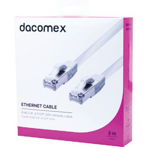 Descriptif du produit :Cordon RJ45 CAT. 6 F/UTP LSOH snagless DACOMEX Longueurs : 5 m Type de câble : RJ45 CAT.6 F/UTP Cordon patch blindé CAT. 6 F/UTP LSOH snagless DACOMEX Ce cordon réseau Ethernet blindé de catégorie 6 permet de connecter son ordinateur (PC, MAC, Chromebook...) équipé d'un port de connextion RJ45 à Internet via la box ou à un réseau local domestique et d'entreprise. Et ainsi de profite ...