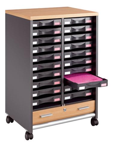 - Ingénieuse et pratique, cette dessert offre de multiples possibilités pour classer et ranger ! Avec ses colonnes et ses nombreux tiroirs, elle est spécialement étudiée pour accueillir un maximum de dossiers. Grâce à ses 3 couleurs d’étiquette/tiroir, vous saurez toujours où les retrouver. Autre atout : sa solidité ! Fabriquée en panneaux de particules mélaminés, cette desserte conjugue parfaitement résistance et longévité. Et pour plus de sécurité et de confidentialité, elle est aussi munie d'une serrure à clé (2 clés fournies). Avec son bel aspect hêtre associé à la couleur grise, cette professionnelle du classement trouvera facilement sa place dans vos locaux. Très esthétique, elle est équipée d'un rideau complètement escamotable qui s'ouvre de haut en bas. Et pour la déplacer en toute facilité, elle est équipée de 4 roues multidirectionnelles. Disponible en deux modèles :- 20 tiroirs : 2 colonnes de 10 tiroirs- 12 tiroirs : 2 colonnes de 6 tiroirsDimensions utiles des tiroirs, modèle 20 tiroirs : H 5 x L 25 x P 36 cmDimensions utiles des tiroirs, modèle 12 tiroirs : H 10 x L 25 x P 36 cmDimensions totales : H 90 x L 58 x P 45 cmMontage en option.Normes et environnement :Ce produit est écoresponsable car il est certifié PEFC. Label international, PEFC assure une gestion durable des forêts et garantit l’origine et la traçabilité du bois utilisé dans la fabrication des produits.