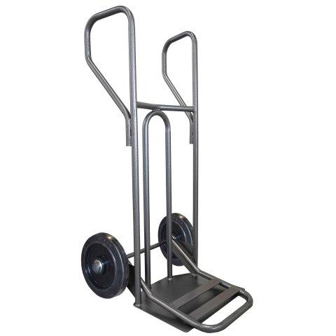 DIABLE ACIER TABLIER INCURVÉ POIGNÉE FERMÉE GRANDE PELLE 250 KG ROUES CAOUTCHOUC NOIR, BAVETTE RABATTABLE