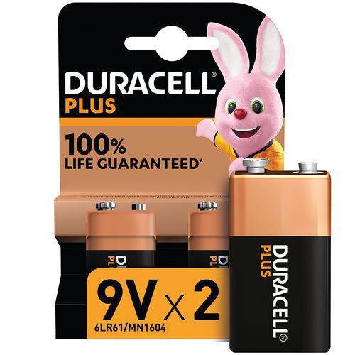 Pile Alcaline 9 V Plus 100 % 2 unités Duracell Approche écoresponsable : oui Capacité (électrique) : 0.75 Ah Coloris : Noir/orange Convient pour : électronique Écolabel Nordic Swan : oui Emballage recyclable : Oui 100 % Emballage recyclé : 94 % Garantie client : 3 ans Nb de piles : 2 Produit recyclable : Oui 100 % Technologie : Alcaline Tension : 9 V Type de pile : LR61/9 V Duracell Plus sont des piles alcalines idéales pour alimenter tous vos appareils. La pile alcaline 9V Duracell Plus offre une durée de vie garantie à 100 %. Les piles Duracell inutilisées peuvent conserver toute leur énergie jusqu’à 10 ans dans leur emballage et dans des conditions normales de stockage. Pile Alcaline 9 V Plus 100 %, Type de pile: LR61/9 V, Nb de piles: 2, Tension: 9 V, Technologie: Alcaline, Capacité (électrique): 0.75 Ah, Emballage recyclable: Oui 100 %, Emballage recyclé: 94 %, Produit recyclable: Oui 100 %, Approche écoresponsable: oui, Convient pour: électronique, Coloris: Noir/orange