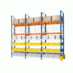Echelles : en acier galvanisé sendzimir, profil T150, section 80 x 70 x 1,5 mm. Platine métal tôle galvanisée : 160 x 112 x 4 mm, munie de perforation Ø 14 mm. Perforation (réglable au pas) : 50 mm. Finition peinture époxy, coloris bleu RAL 5010.Lisses \'\'picking\'\' uniquement pour stockage manuel : profil feuillure section 65 x 36 x 1,2 mm, coloris gris perle RAL 7035. Recouvrement platelage aggloméré ép. 19 mm.Lisses rack à palettes : profil section 80 x 50 x 2 mm. Finition peinture époxy, coloris orange RAL 2004.H.450 cm : 4 niveaux de stockage manuel + 2 niveaux de rack à palettes.
