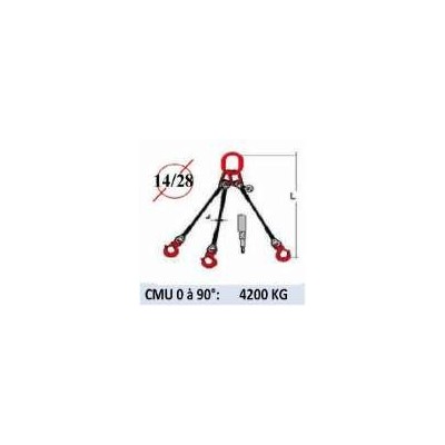Descriptif du produit :Elingue 3 brins fidafor crochets à linguet Diamètre de câble: 14 millimètres Diamètre : gaine 28 millimètres Charge maximale d'utilisation : 1 brin : 2000kg Charge maximale d'utilisation : 3 brins 0 à 90° : 4200kg Longueur : 2m