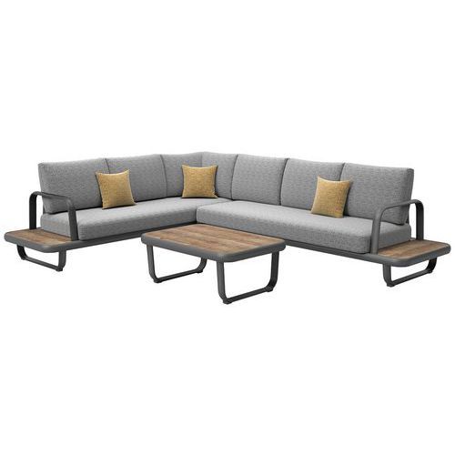 Ensemble détente Darwin : 1 table basse 1 canapé d'angle Assise coloris : Gris Assise matériau : Polyester Dossier coloris : Gris Dossier matériau : Polyester Environnement : Intérieur et extérieur Fréquence d'utilisation : Régulière Garantie client : 2 ans Livré monté : non Piétement coloris : Gris Poids : 85 kg Usage : Collectivité Ensemble détente Darwin composé : 1 table basse structure aluminium, peinture époxy. Plateau SPC imitant à la perfection la couleur et les nervures du bois. L/H/P : 110 x 36 x 70 cm. 1 méridienne d'angle : Tablettes en bout de méridienne, plateau SPC imitation bois. Structure en aluminium, peinture époxy. L/H/P : 224 x 64 x 74 cm. Coussins en polyester, déhoussables. Toile polyester 225gr/m², traitement déperlant. Densité coussins d'assise : 25 kg/m3 Ensemble détente Darwin : 1 table basse 1 canapé d'angle, Assise matériau: Polyester, Dossier matériau: Polyester, Assise coloris: Gris, Dossier coloris: Gris, Piétement coloris: Gris, Livré monté: non, Fréquence d'utilisation: Régulière, Poids: 85 kg, Usage: Collectivité