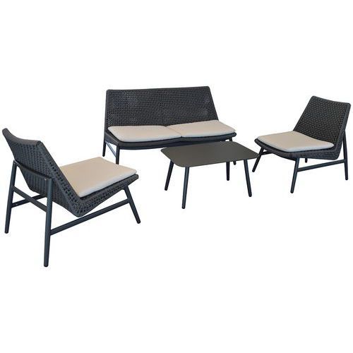 Ensemble détente Irving : 1 table basse 1 canapé 2 fauteuils Assise coloris : Beige Assise hauteur : 40 cm Assise matériau : Résine Dossier coloris : Anthracite Dossier matériau : Résine Empilable : non Environnement : Intérieur et extérieur Fréquence d'utilisation : Régulière Garantie client : 2 ans Livré monté : oui Piétement coloris : Anthracite Poids : 37 kg Usage : Collectivité Ensemble détente Irving composé de : 1 table basse rectangulaire : L/H/P 80 x 40 x 55 cm. 1 fauteuil : L/H/P 66 x 88 x 81 cm Largeur d’assise : 60 cm 1 canapé 2 places : L/H/P 141 x 83 x 81 cm. Largeur d’assise : 138 cm. Structure en aluminium. Assise et dossier en rope. Galette déhoussable. Facile d'entretien Ensemble détente Irving : 1 table basse, Assise matériau: Résine, Dossier matériau: Résine, Assise coloris: Beige, Dossier coloris: Anthracite, Piétement coloris: Anthracite, Assise hauteur: 40 cm, Livré monté: oui, Fréquence d'utilisation: Régulière, Poids: 37 kg, Empilable: non, Usage: Collectivité