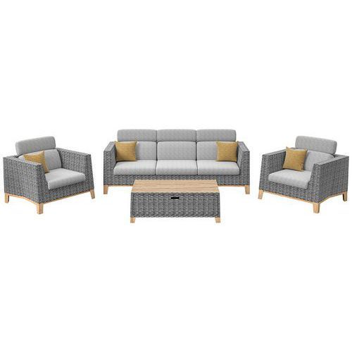Ensemble détente Ivano : 1 table basse 2 fauteuils 1 canapé Assise coloris : Gris Assise matériau : Polyester Dossier coloris : Gris Dossier matériau : Polyester Environnement : Intérieur et extérieur Fréquence d'utilisation : Régulière Garantie client : 2 ans Livré monté : oui Piétement coloris : Gris Poids : 87 kg Usage : Collectivité Ensemble détente Ivano composé : 1 table basse rectangulaire, plateau SPC (béton + résine). Rangement sous le plateau. L/H/P : 110 x 40 x 60 cm. 1 canapé 3 places : L/H/P : 214 x 64 x 80 cm 2 fauteuils : L/H/P : 94 x 64 x 80 cm. Structure en aluminium. Dossier et assise : résine synthétique 8 mm, tressée à la main. Coloris naturel. Coussins déhoussables, polyester déperlant 240 gr/m2. Densité coussins 25 kg/m3. Ensemble détente Ivano : 1 table basse 2 fauteuils 1 canapé, Assise matériau: Polyester, Dossier matériau: Polyester, Assise coloris: Gris, Dossier coloris: Gris, Piétement coloris: Gris, Livré monté: oui, Fréquence d'utilisation: Régulière, Poids: 87 kg, Usage: Collectivité