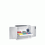 Plateau haute densité surfacé mélaminé coloris grisChants droits ABS Châssis hauteur 800 mm sous plateau 2 pieds échelle en tube acier carré de 60 mm (épaisseur 20/10ème pliée). 3 entretoises en tôle 25/10ème pliée en U 60x 40 dont 1 servant de repose-pieds. Chaque pied est équipé d\'un embout plastique (jeu de 4 pieds réglables en option). Plage de réglage : 20 mm. Caisson suspe ...