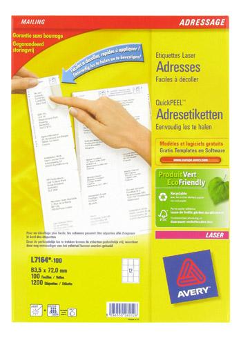 ETIQUETTE ADRESSE LASER 63,5 X 72 MM AVERY L7164-100 BLANCHE - BOÎTE DE 1200