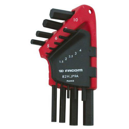 Descriptif du produit :Jeu de clés mâles courtes 6 pans Facom Clés métriques Capacité (Dimensions) : 1.5 2 2.5 3 4 5 6 8 10 mm Empreinte vis : 6 pans creux Modèle : Mâle coudée courte Nb de clés : 9 Nb de pans : 6 Réf. Fabricant : 82H.JP9A Usage : Serrage Jeu de clés en étui compact. Ouverture portefeuille. Jeu de clés mâles courtes 6 pans Facom, Empreinte vis: 6 pans creux, Nb de ...