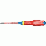 Tournevis PROTWIST® isolés 1000 Volts pour vis cruciformes Phillips® Coloris : Rouge Embout largeur : 36 mm Lame longueur : 125 mm Norme : ISO 2380 Poids du produit : 120 g Réf. Fabricant : ATP2X125TVE Type de lame : Phillips Type d'embout : Protwist Usage : Vissage Pour votre sécurité, chaque tournevis est testé individuellement à 10000 Volts pendant 10 secondes approuvé VDE, en fin de cycle de fabrication. Traitement thermique en ligne : + 100% de durée de vie et + 100% de résistance. Matière du manche : Soft Grip pour plus de confort et toujours résistant aux produits chimiques. Traitement « tricoating » de la lame (ZincNickelChrome) : 4 fois plus de résistance à la corrosion. Ergonomie optimisée du manche : + 10% de couple. Marquage laser : pour une meilleure résistance à l'usure. Usinage des empreintes par commande numérique : meilleure adaptation de la vis en augmentant le transfert de couple et en réduisant l'usure. Tournevis PROTWIST® isolés 1000 Volts pour vis cruciformes Phillips®, Type de lame: Phillips, Réf. Fabricant: ATP2X125TVE, Lame longueur: 125 mm, Embout largeur: 36 mm, Usage: Vissage, Poids du produit: 120 g, Type d'embout: Protwist, Coloris: Rouge