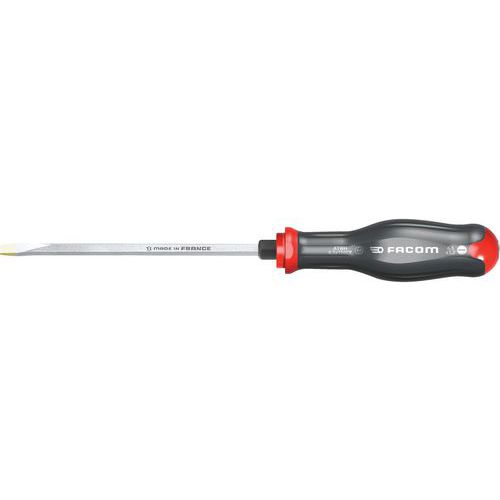 Tournevis PROTWIST® SHOCK pour vis à fente Coloris : Noir Embout largeur : 25 mm Empreinte vis : Fente Lame longueur : 100 mm Longueur totale : 204 mm Manche longueur : 104 cm Norme : ISO 2380 Poids du produit : 57 g Réf. Fabricant : ATW4X100CK Type de lame : Plate Type d'embout : Channel Usage : Vissage Insert métallique large et bombé pour protéger la zone de frappe, associé à une lame hexagonale en acier 73MO. Lame hexagonale avec écrou permettant les dévissages difficiles à l'aide d'une clé. Traitement thermique en ligne : + 100% de durée de vie et + 100% de résistance. Matière du manche : Soft grip pour plus de confort et toujours résistant aux produits chimiques. Traitement « tricoating » de la lame (ZincNickelChrome) : 4 fois plus de résistance à la corrosion. Ergonomie optimisée du manche : + 10% de couple. Marquage laser : pour une meilleure résistance à l'usure. Usinage des empreintes par commande numérique : meilleure adaptation de la vis en augmentant le transfert de couple et en réduisant l'usure. Tournevis PROTWIST® SHOCK pour vis à fente, Empreinte vis: Fente, Réf. Fabricant: ATW4X100CK, Lame longueur: 100 mm, Longueur totale: 204 mm, Manche longueur: 104 cm, Poids du produit: 57 g, Type de lame: Plate, Type d'embout: Channel, Embout largeur: 25 mm