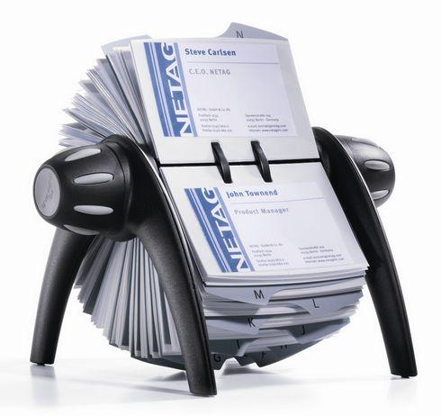 Descriptif du produit :- Vous disposez de nombreuses cartes de visite de vos contacts et ne savez pas comment les stocker de manière pratique ? Choisissez le fichier rotatif ouvert Visifix Flip Durable. Ses avantages : Modèle pour classer jusqu’à 400 cartes professionnelles de format 54 x 104 mm. Des ouvertures latérales sur les pochettes facilitent l’insertion des cartes.Les encoches sur la partie basse simplif ...